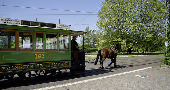 Die erste Pferdebahn-Linie wurde am 19. Mai 1872 für den Personenverkehr eröffnet und führte vom Schönhof über die Leipziger Straße, Bockenheimer Landstraße und Bockenheimer Tor (heutiger Opernplatz) zur Hauptwache.