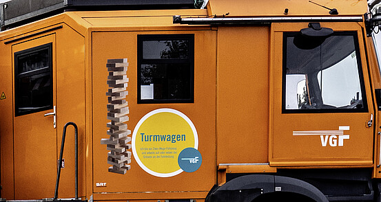 Der Turmwagen ist das Flaggschiff in der Bahnstromversorgung. Mit ihm kann wir auf der Straße und auf Schienen gefahren werden und aufgrund seiner Bauform sogar im Tunnel. Mit seiner isolierten Arbeitsbühne kann während des Betriebes an der Fahrleitung gearbeitet werden, ohne dass der Strom abgeschaltet werden muss.